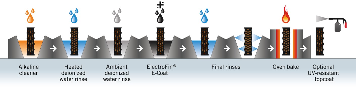 This special coating is ELECTROFIN, a factory-applied electro-deposition coating process that guarantees complete heat exchanger coverage. The coil is immersed in a bath. Here the coil acts as a magnet and attracts the coating to every surface. The result is a thin, flexible, durable, corrosion-resistant coating.